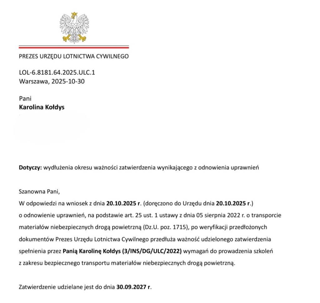 I am pleased to inform that the President of the Civil Aviation Authority has extended the validity of my approval confirming compliance with the requirements for conducting training in the transport of dangerous goods by air.