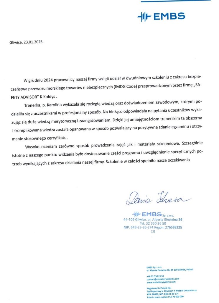 Wraz z wykonywaniem powierzonych mi prac, skrupulatnie realizuję i rozwijam cel, który wyznaczyłam przed rozpoczęciem działalności z zakresu problematyki magazynowania i przewozu towarów niebezpiecznych: