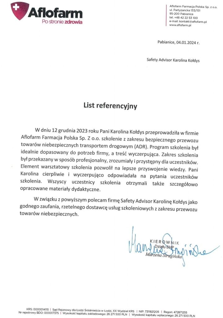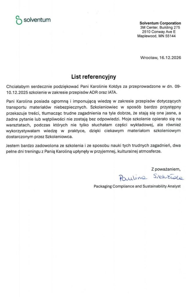 Wraz z wykonywaniem powierzonych mi prac, skrupulatnie realizuję i rozwijam cel, który wyznaczyłam przed rozpoczęciem działalności z zakresu problematyki magazynowania i przewozu towarów niebezpiecznych: