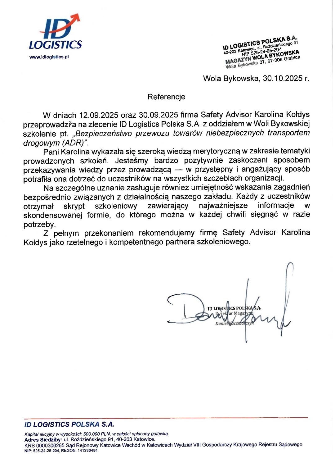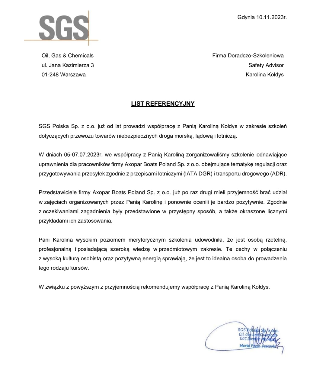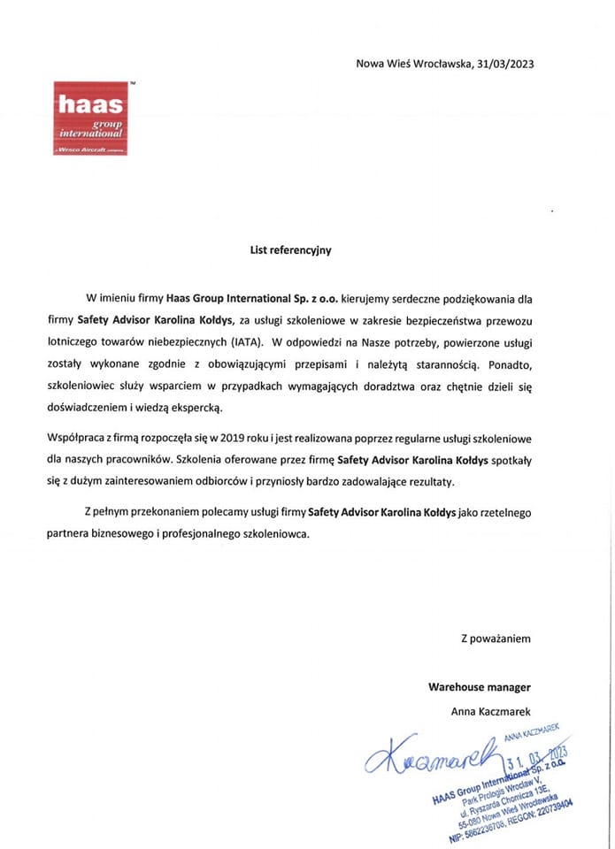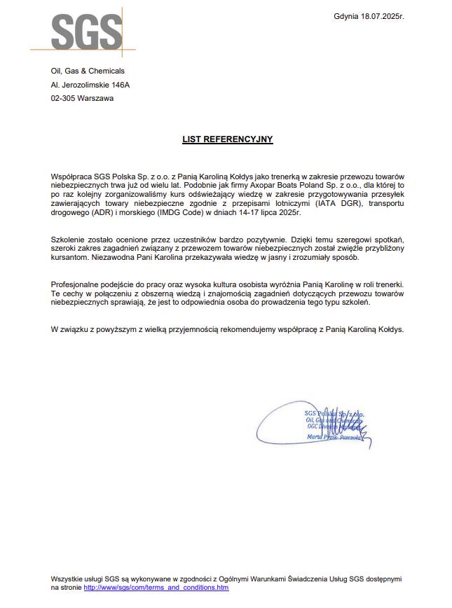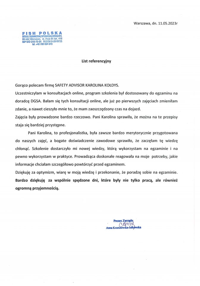 Wraz z wykonywaniem powierzonych mi prac, skrupulatnie realizuję i rozwijam cel, który wyznaczyłam przed rozpoczęciem działalności z zakresu problematyki magazynowania i przewozu towarów niebezpiecznych: