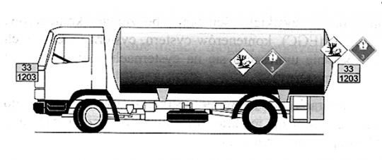 Pojazd przewożący UN 1202 i UN 1203 w cysternie wielokomorowej – przykład oznakowania
