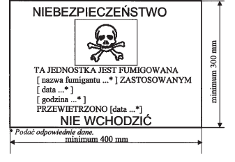Znak ostrzegający o fumigacji umieszcza się przy każdym otworze w taki sposób, aby był dobrze widoczny dla osób otwierających lub wchodzących do jednostki poddanej fumigacji.