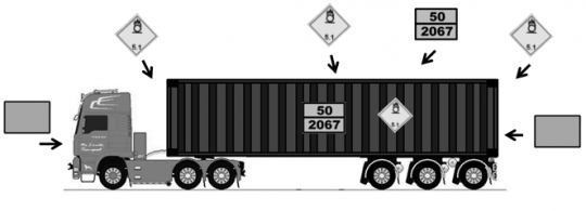 Jednostki transportowe lub kontenery w których przewożone są towary niebezpieczne luzem powinny być zaopatrzone na bokach każdej jednostki transportowej lub kontenera w tablice barwy pomarańczowej, zawierające numer rozpoznawczy zagrożenia i numer UN, umieszczone równolegle do osi podłużnej pojazdu (5.3.2.1.4 Umowa ADR). Z przodu i z tyłu jednostki transportowej powinny być umieszczone tablice pomarańczowe gładkie, obie prostopadle do osi podłużnej tej jednostki (patrz 5.3.2.1.1 Umowa ADR). Jeżeli tablice barwy pomarańczowej z numerem rozpoznawczym zagrożenia i numerem UN, umieszczone na kontenerach nie są dobrze widoczne z zewnątrz pojazdu, to takie same tablice powinny być również umieszczone na obu bokach tego pojazdu (patrz 5.3.2.1.5 Umowa ADR).